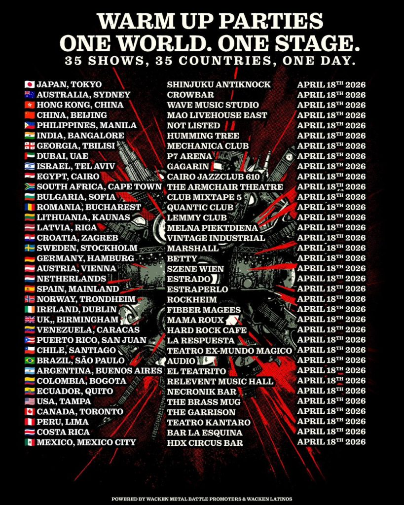 La iniciativa “One World, One Stage” es, en esencia, una declaración de principios. Wacken siempre ha sido más que un festival; es una peregrinación, un estilo de vida. Pero no todos pueden permitirse el lujo de viajar al norte de Alemania, pagar el boleto y sobrevivir a la logística de una semana en un camping. Con estas warm up parties, el festival demuestra que la comunidad metalera es una sola sin importar el país. Desde Japón al amanecer hasta Perú al atardecer, 35 naciones se unirán en un solo día, demostrando que la distancia no es excusa para la devoción. Cada país anfitrión presentará a sus propios héroes locales del metal, unidos a través de presentaciones en vivo y una energía global compartida.